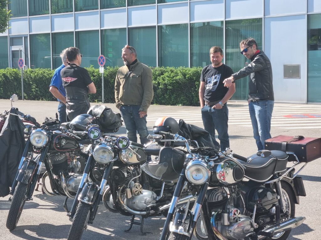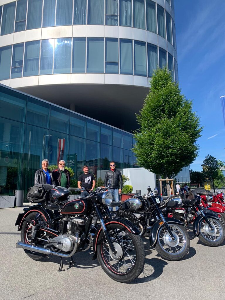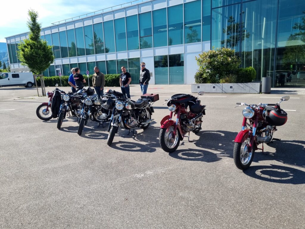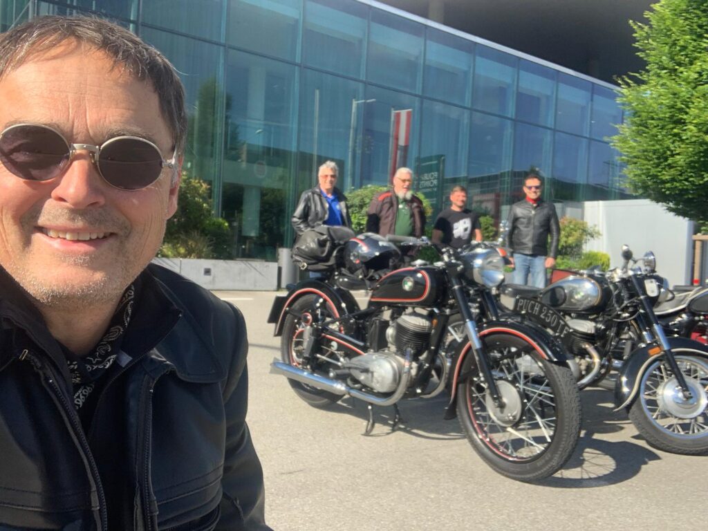 Puchfreunde beim Panoramahaus in Dornbirn, um an der Motorradsegnung in