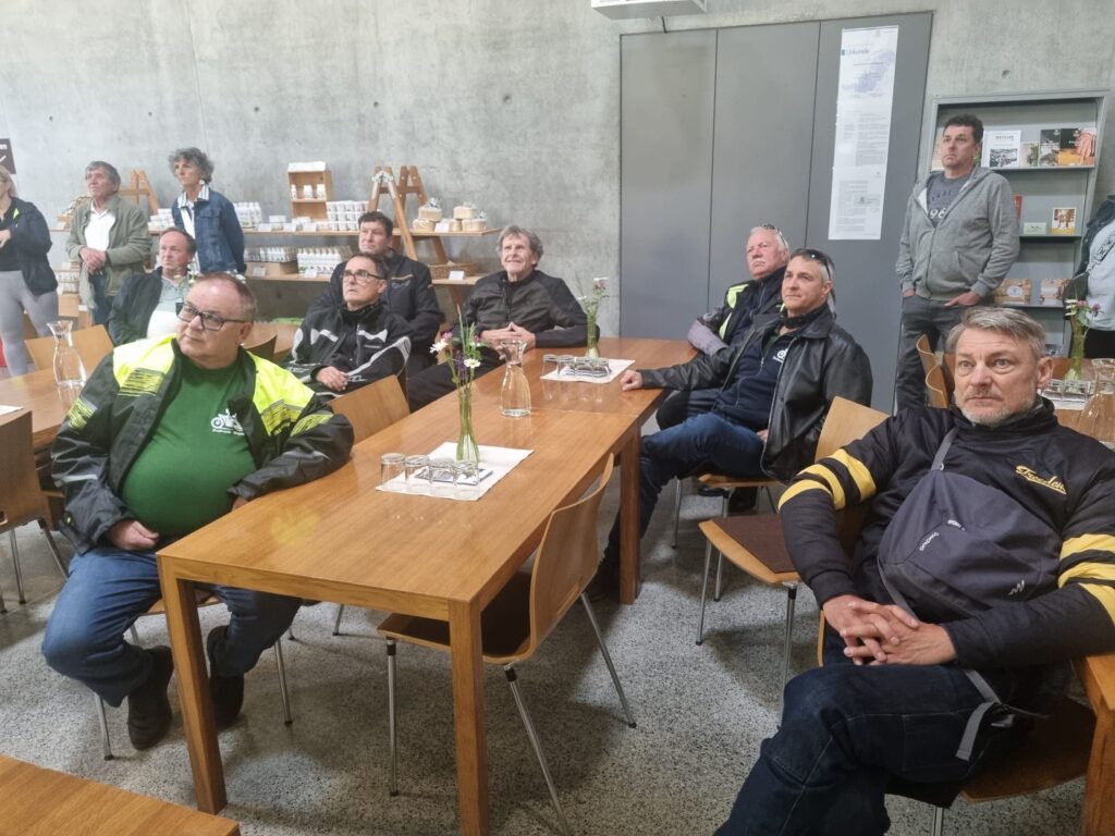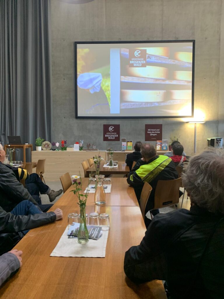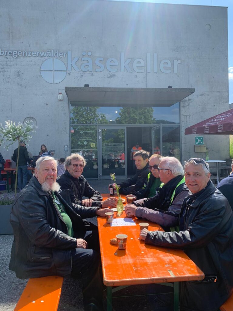 Kaum hatten die Puch-Oldies ihre Motoren gestartet, rollten sie los, begleitet von der „Kühlschrank-Temperatur“ – denn bei 7° ist alles noch schön frisch, auch die Stimmung! Nach einer kurzen gemütlichen Fahrt von unserem Startpunkt Alberschwende aus durch den Bregenzerwald erreichten wir den Käsekeller in Lingenau, wo wir mit gratis Kaffee und Gebäck verwöhnt wurden. Das Gebäck war so lecker, dass man fast vergaß, dass es eigentlich nur eine Zwischenmahlzeit war – schließlich wollte man ja noch den Käsekeller bzw. Werbefilm über die Käseherstellung sehen.